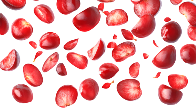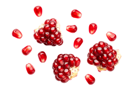 Vibrant red pomegranate seeds and arils artfully arranged, creating a dynamic and juicy visual isolated on white background