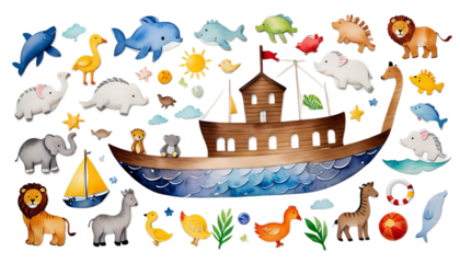 Watercolor Noah’s Ark Floating on Gentle Waves, Surrounded by Smiling Animals and Rainbow, Kids Story Theme, Isolated
