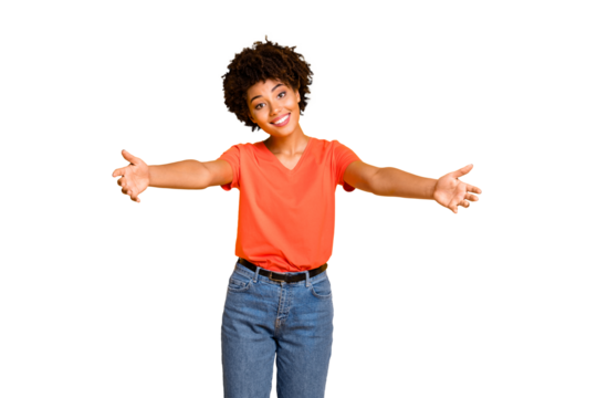 Photo of cheerful charming trendy cute black lady inviting you to hug with her wearing jeans denim orange t-shirt kind and lovely isolated over yellow vivid color background