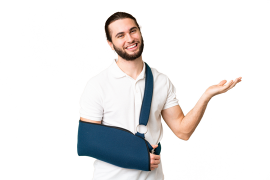 Young handsome man with broken arm and wearing a sling over isolated chroma key background extending hands to the side for inviting to come