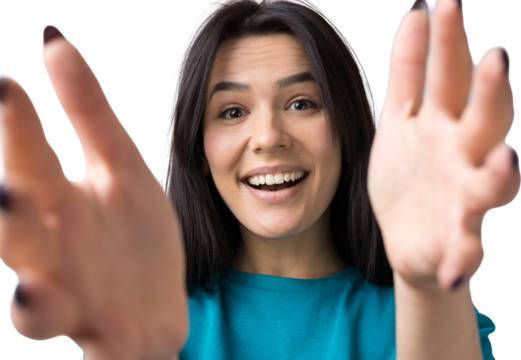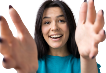 beautiful black brazilian woman in casual clothes inviting with hands. come.