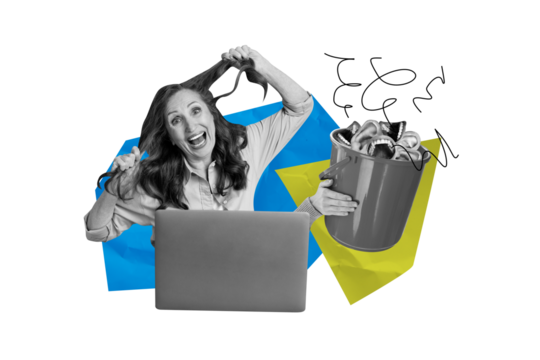 Composite photo collage of tired old woman tear hair scream workload bucket headless parts ear mouth noise isolated on painted background