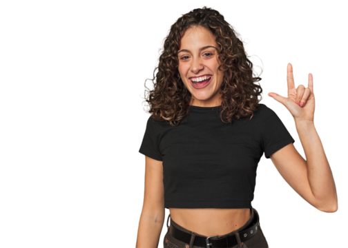 Radiant young woman with stunning curls makes scale with arms, feels happy and confident.