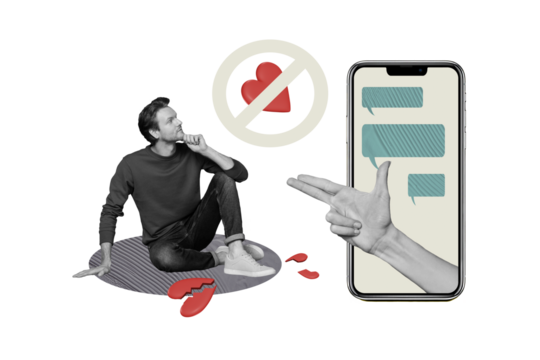 Composite photo collage of minded man watch forbidden sign broke heart quarrel iphone screen correspondence isolated on painted background