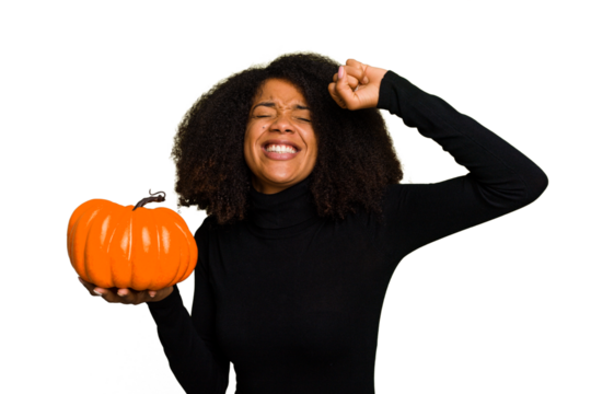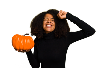 Young African American woman holding a pumpkin for halloween day isolated raising fist after a victory, winner concept.
