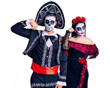 Young couple wearing mexican day of the dead costume over background strong person showing arm muscle, confident and proud of power