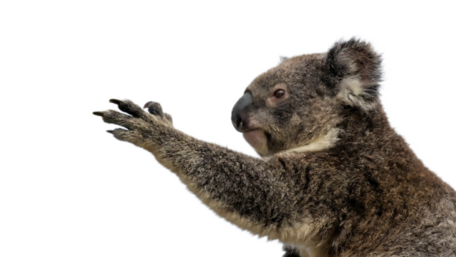Closeup of a koala bear with left arm raised and paw extended isolated on a transparent background animal