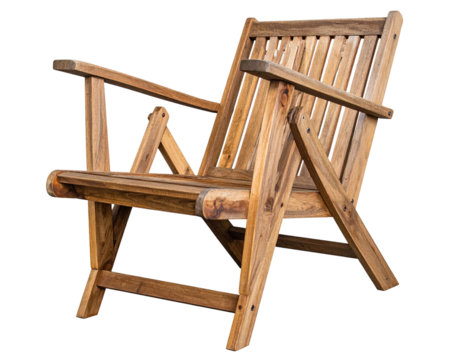 Wooden Adirondack-style chair isolated on black background, warm tones