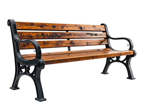 Isolated park bench with stained wooden planks, black ornate iron arms and legs, on a black background