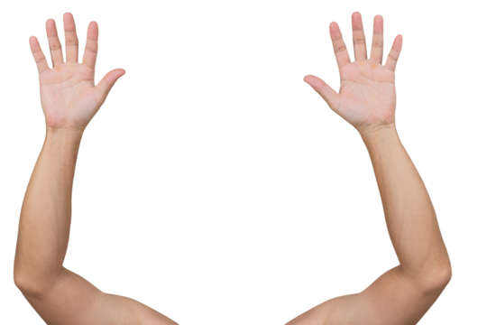 Male hand showing five fingers, palm on white transparent background