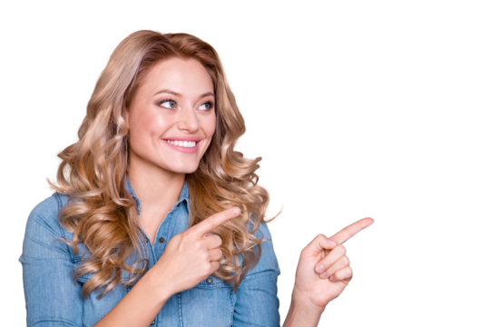 Close up photo amazing beautiful she her lady hold arm hand point watch see empty space propose offer buy buyer new product wearing casual jeans denim shirt clothes outfit isolated grey background