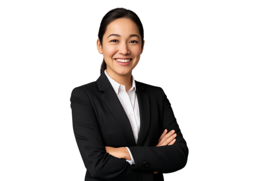 Selbstvertrauen Frau in einem professionellen Anzug mit verschränkten Armen und zeigt ein positives und zugängliches Verhalten