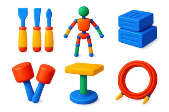 Sculpture Workshop Icons. 3D icon set of sculpture workshop essentials: chisels, armatures, clay blocks, carving mallets, modeling