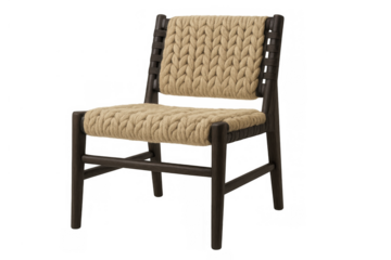 Wooden armchair with woven beige rope backrest and seat creating a comfortable, rustic, and modern furniture piece