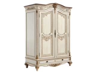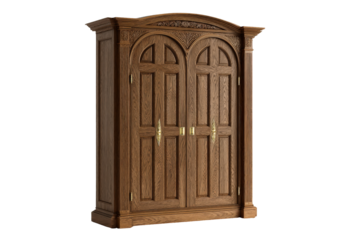 Ornate wooden armoire with carved details and gold hardware on transparent background