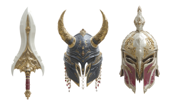 Decorative Armor Set with Elaborate Helmets and Sword Isolated