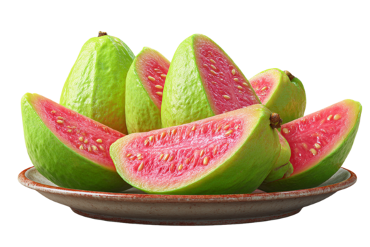 Guava Wedges with Glossy Pink Centers and Seeds on Ceramic Plate, Side View, Transparent Background