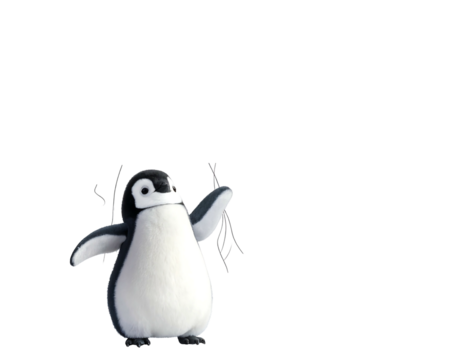 A cute, cartoon-like penguin with white belly and black back and head stands out. Arms raised, looks playful. Background is black