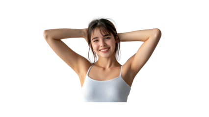 Happy Young Woman with Hands Behind Head, Smiling, White Tank Top