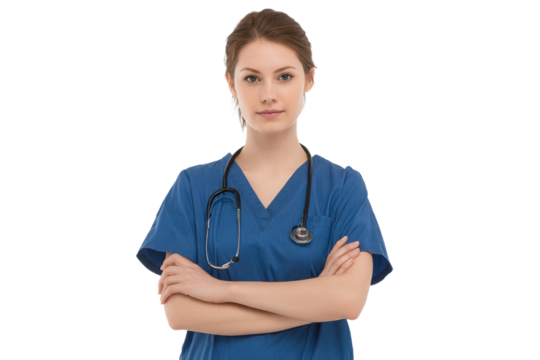 Portrait of a woman wearing a red buttoned t-shirt with folded arms isolated on a transparent background