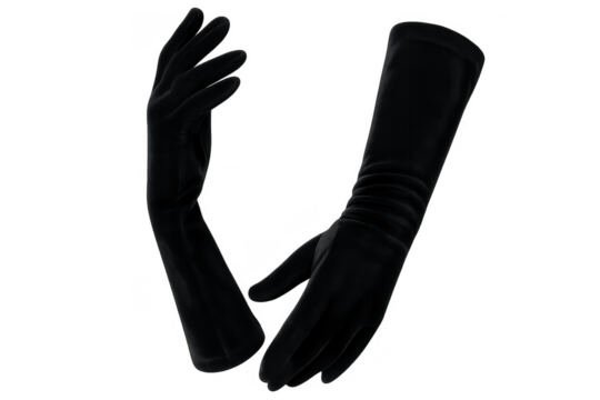 Elegant black long opera gloves isolated on transparent background, classic style