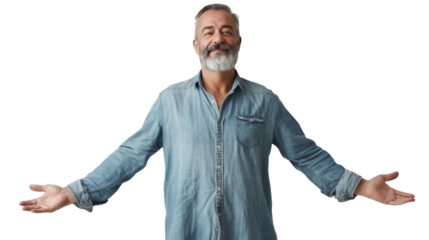 Smiling young man with outstretched arms in casual outfit against transparent background