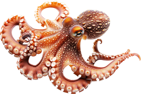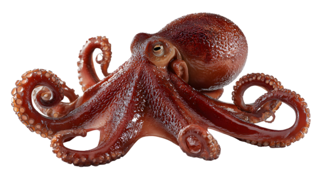 A detailed studio shot of a large, reddishbrown squid with its tentacles spread out, isolated on a transparent background