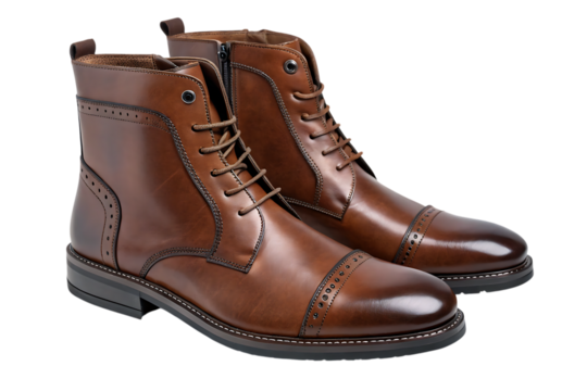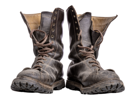 Pair of worn leather boots isolated on transparent background