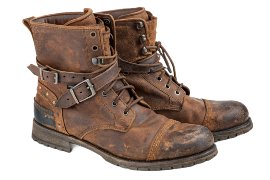 Pair of dirty desert camouflage combat boots with laces tied military, Isolated On Transparent Background, Png Cut Out