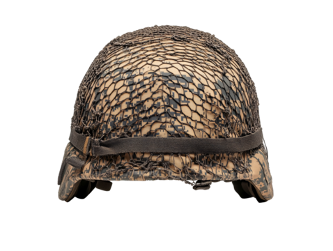 A detailed view of a military helmet featuring camouflage patterns, designed for protection and tactical operations, PNG, transparent, No background.