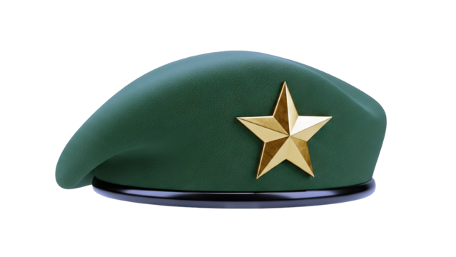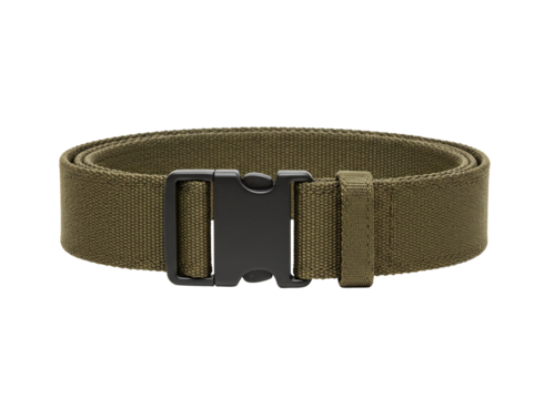 Dog in olive green tactical harness with bags, isolated on transparent background.