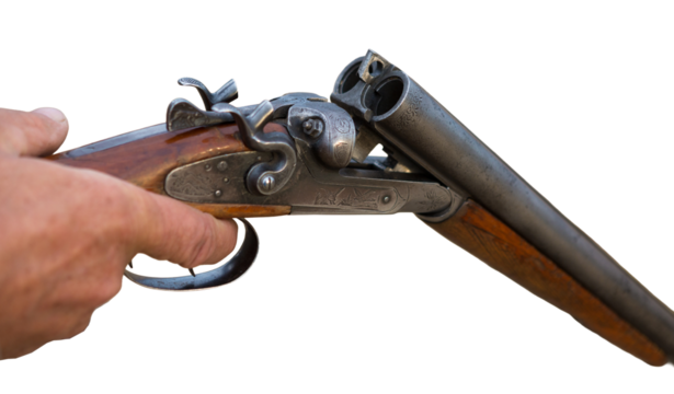 Soldier holding rifle with bullet belt and tactical gear on transparent background