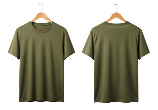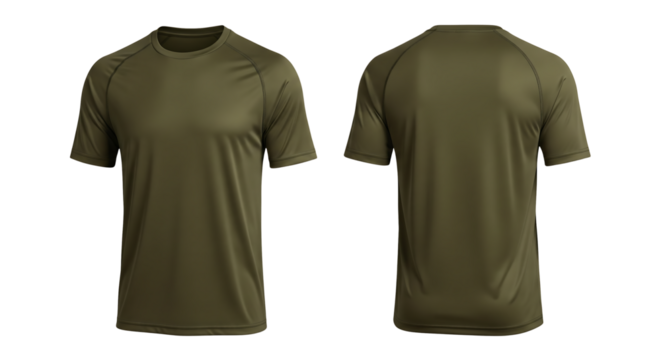 Olive green athletic t-shirt mockup, front and back view for apparel branding. Isolated on transparent background, png