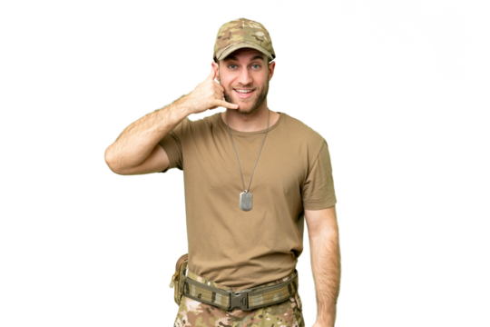 Military with dog tag over isolated chroma key background making phone gesture. Call me back sign