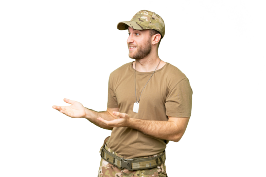 Military with dog tag over isolated chroma key background pointing to the side to present a product