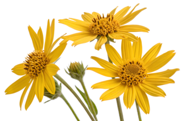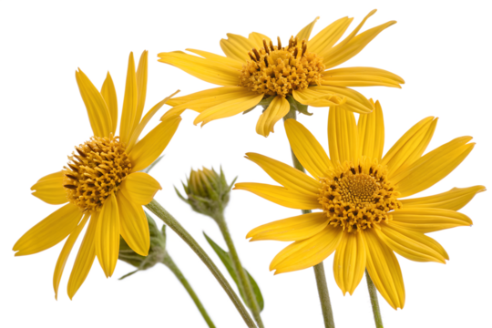 Three Vibrant Yellow Arnica Flowers, isolated on transparent background