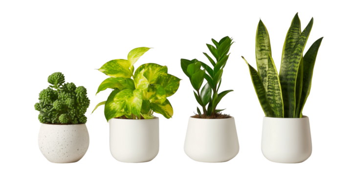Four different potted houseplants in white ceramic pots against a white and transparent background, offering a clean and modern aesthetic, concept for interior design, home decor and minimalist style