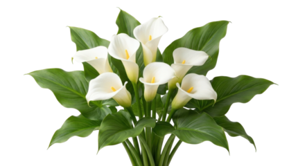 Lush bouquet of white calla lilies with green leaves on transparent background