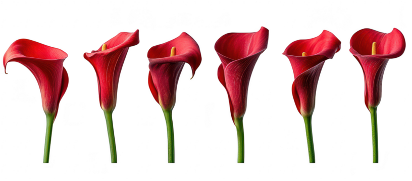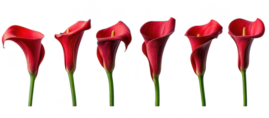 A stunning arrangement of six red calla lilies their elegant curves and textures against a pure white background. ideal for floral design inspiration or botanical art