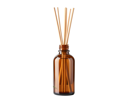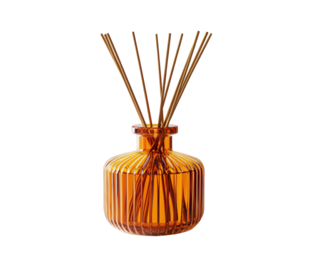 Amber glass reed diffuser isolated on white background. PNG transparent.