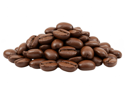A front view of a heap of rich brown coffee beans isolated on transparent background