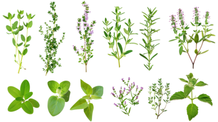 A collection of fresh aromatic herbs including sage, rosemary, basil, and thyme, cut out transparent