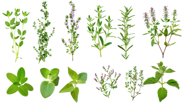 Fresh thyme herb sprigs with vibrant green leaves and woody stems, isolated on transparent background, ideal for culinary, aromatic seasoning, kitchen herbs, natural, organic, detailed texture, herba