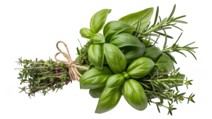 Fresh herbs bundle with basil rosemary thyme isolated on a transparent background