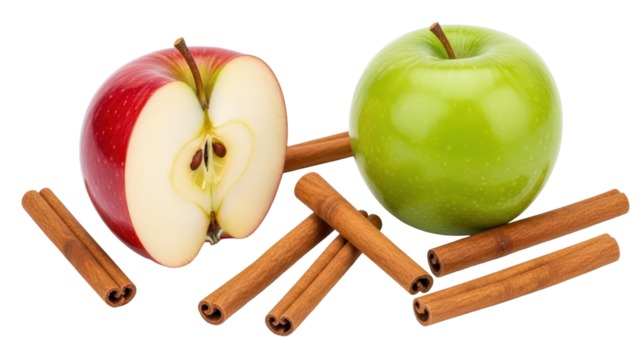 Healthy whole green apple, cut red apple, and aromatic cinnamon isolated on transparent background