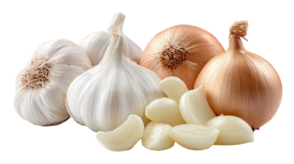 Two piles one of garlic and one of onion bulbs whole and sliced on transparent background