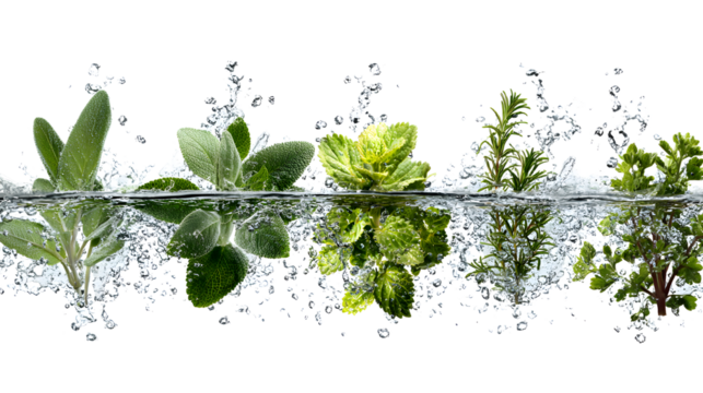 Fresh aromatic herbs and flowers splashing in water on white background, herbs collection, natural botanical ingredients, perfect for healthy lifestyle or cooking concepts