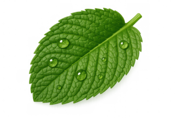 Vibrant fresh basil leaf with water droplets on a stark macro view on transparent background