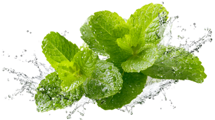 Crisp green mint leaves splashing in water, isolated on transparent background.
