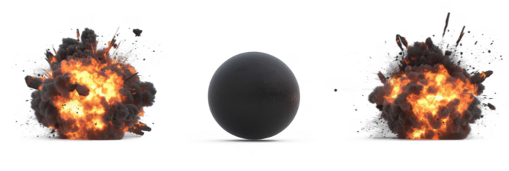 Explosive Fireballs Erupting Around Central Black Sphere in Dramatic Scene, isolated on transparent background